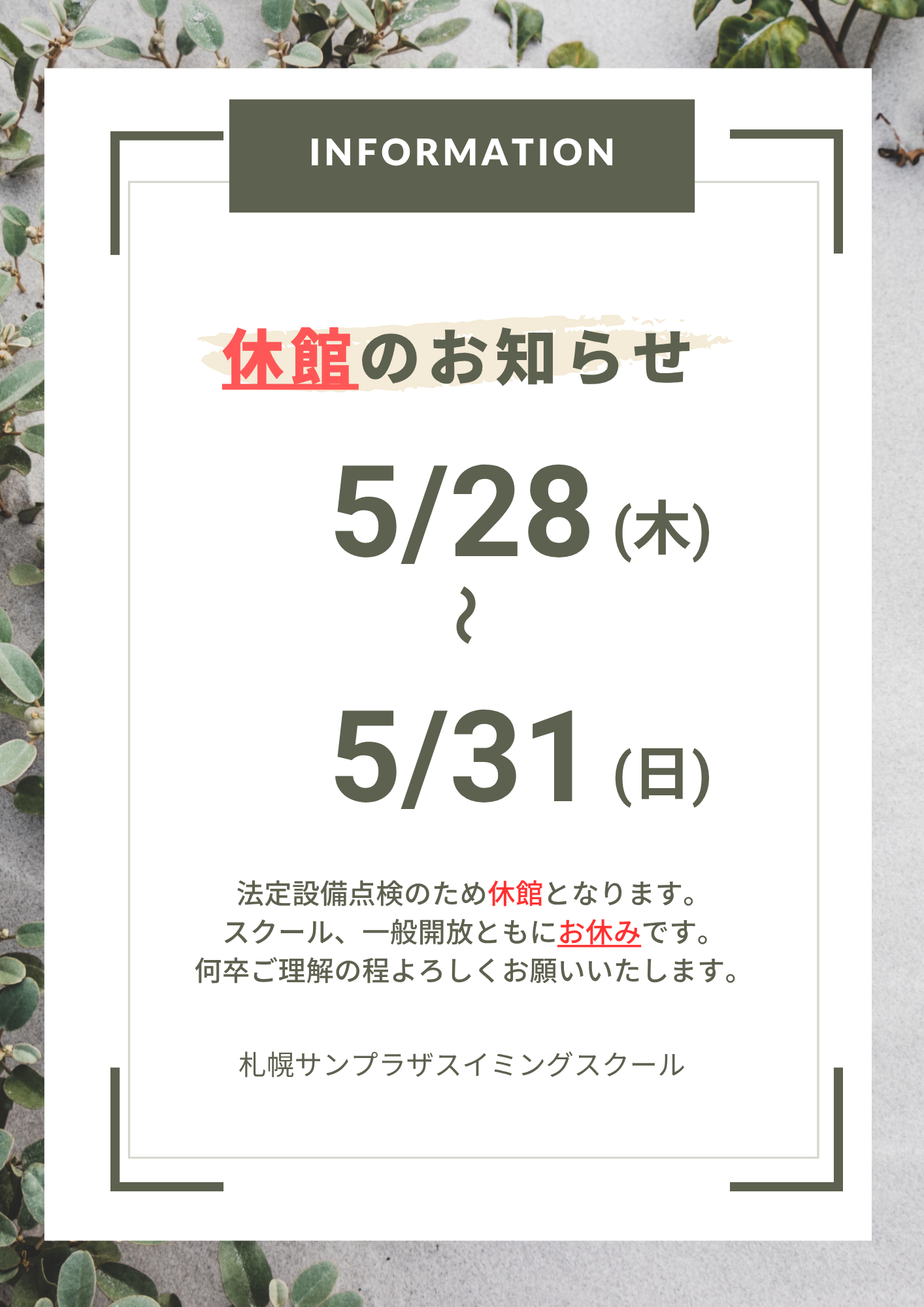 5/28~5/31は法定設備点検の為、休館とさせていただきます。
